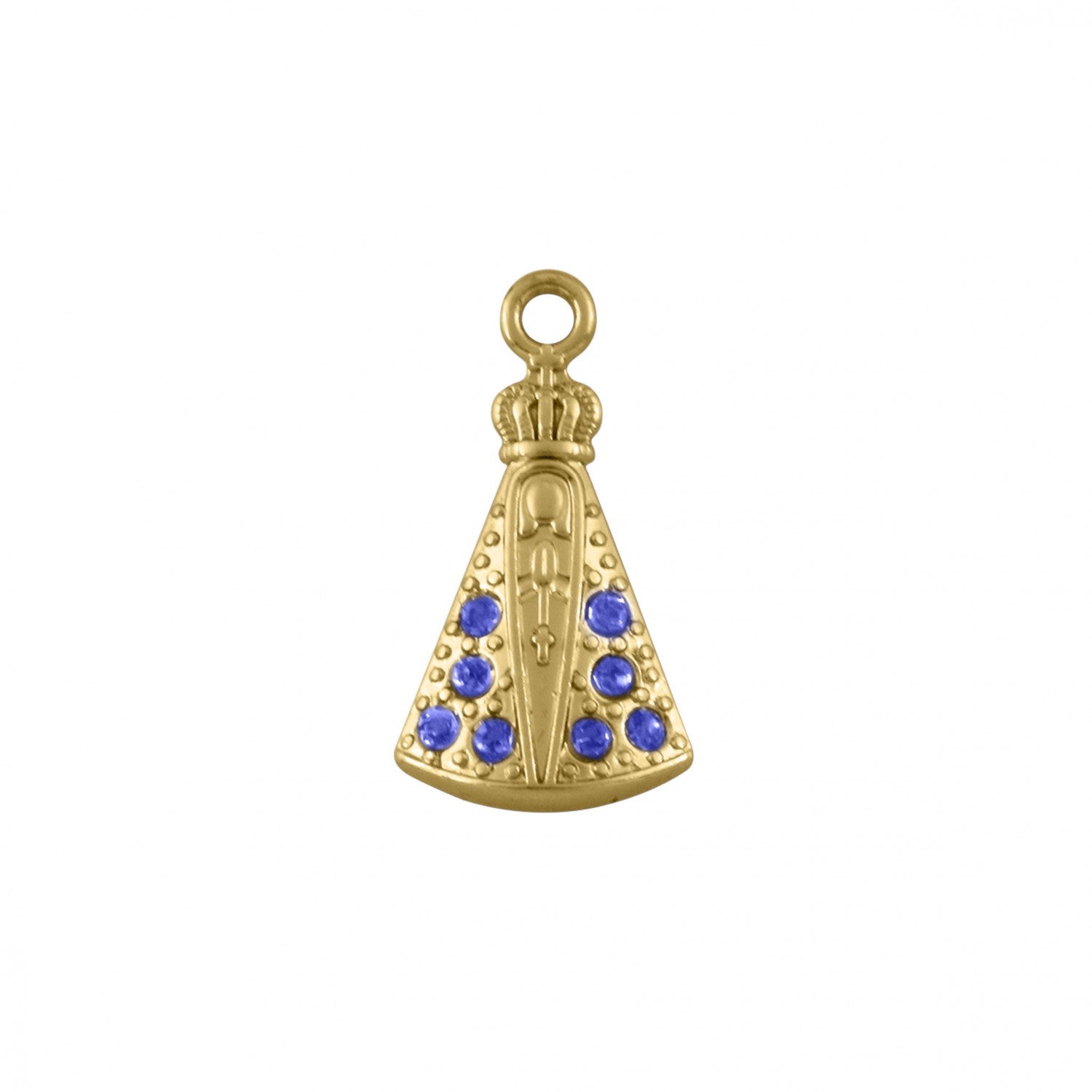 Pingente religioso de Nossa Senhora com detalhe em strass azul.